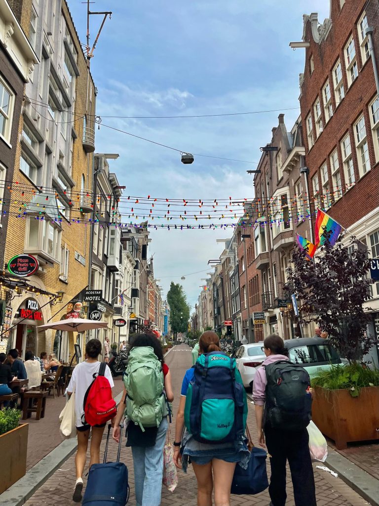 We slept in hostel rooms with other people, which wasnโt always easy, but it gave us lots of funny stories to tell our friends. One of our favourite memories is the last evening in Amsterdam, when after hours of raining the sky opened up with an amazing sunset lighting up the city.